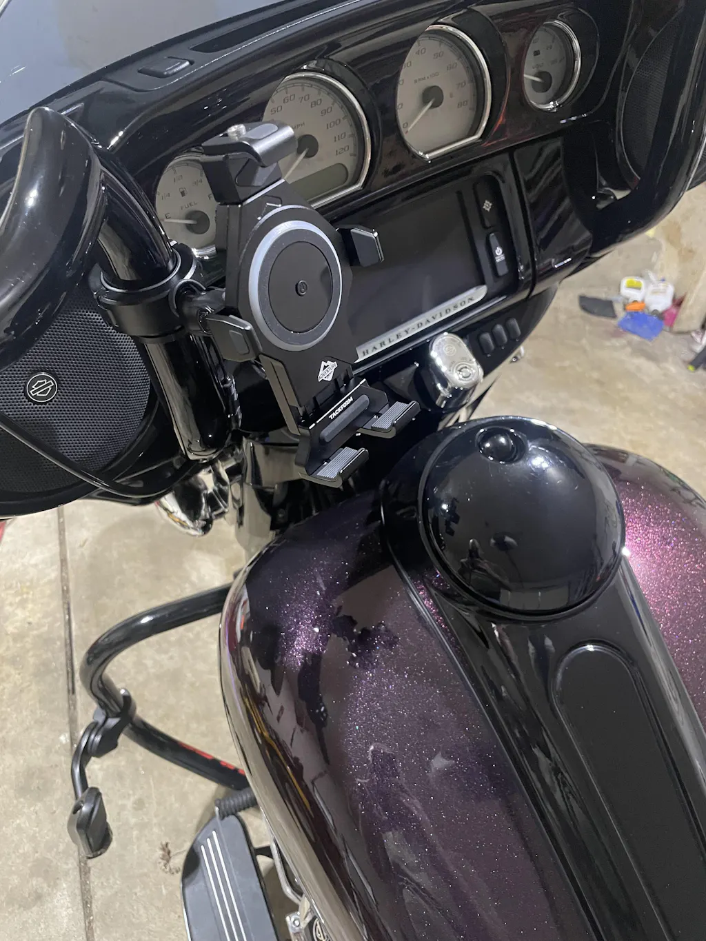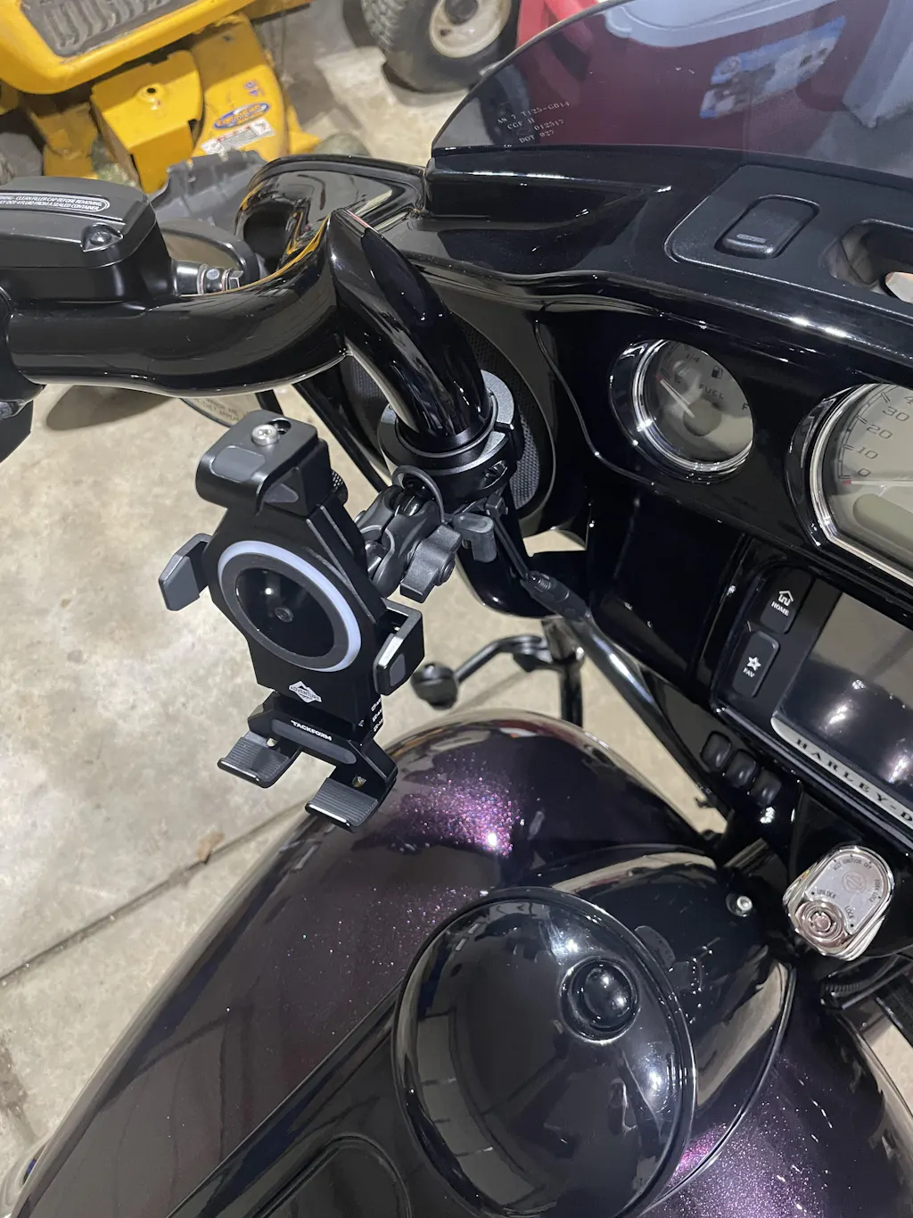 Motorcycle Phone Mount with Wireless Charging, Vibe Dampening and Anti-Theft Features.