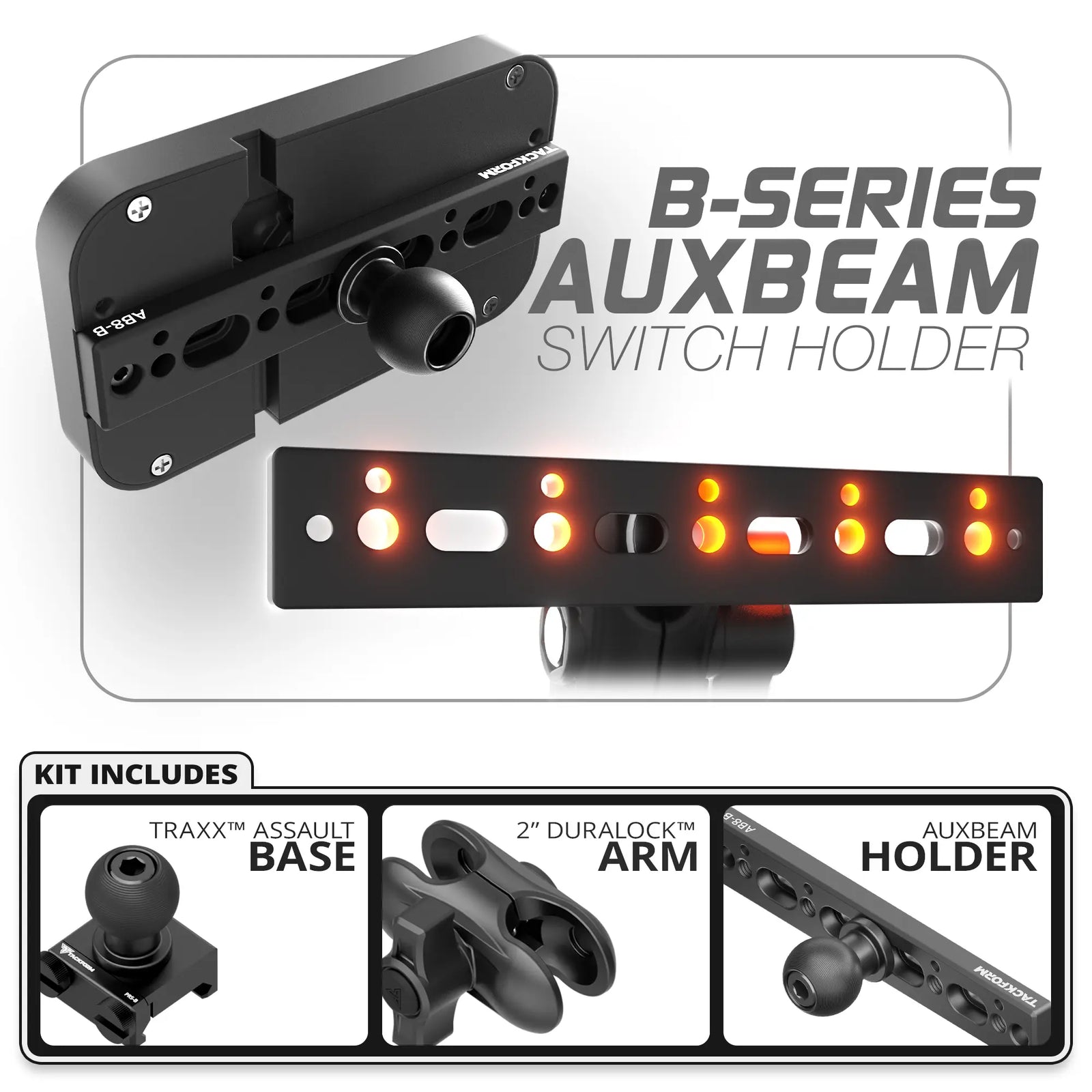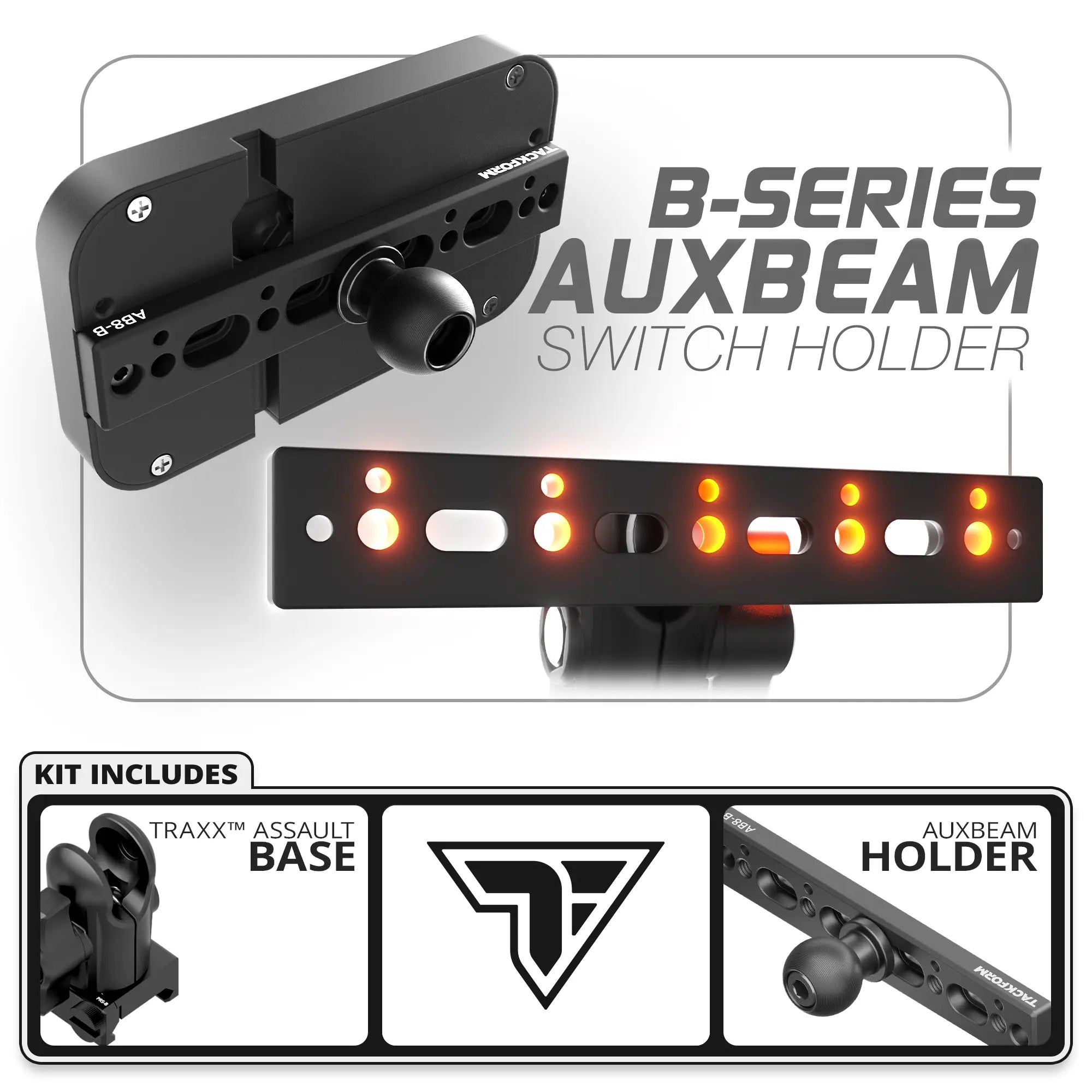 This mount replaces the factory Auxbeam bracket, providing Type-B connection points for versatile center, left, or right offset positioning of your switch panel. See compatibility info for more details.