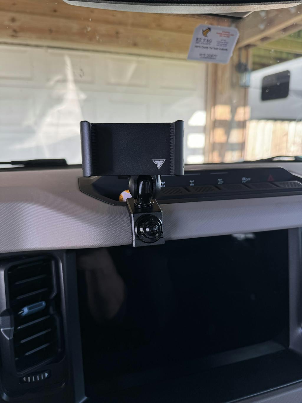 As an excellent solution for those seeking a mount with a smaller footprint, our Top Dash Clip seamlessly attaches to the front of your Bronco's dashboard, just above the screen. With its innovative design, the Top Dash Clip offers an extended installation range, giving you greater flexibility in positioning it across a wider area of your dashboard—surpassing the capabilities of comparable mounts, which typically provide only half the range.