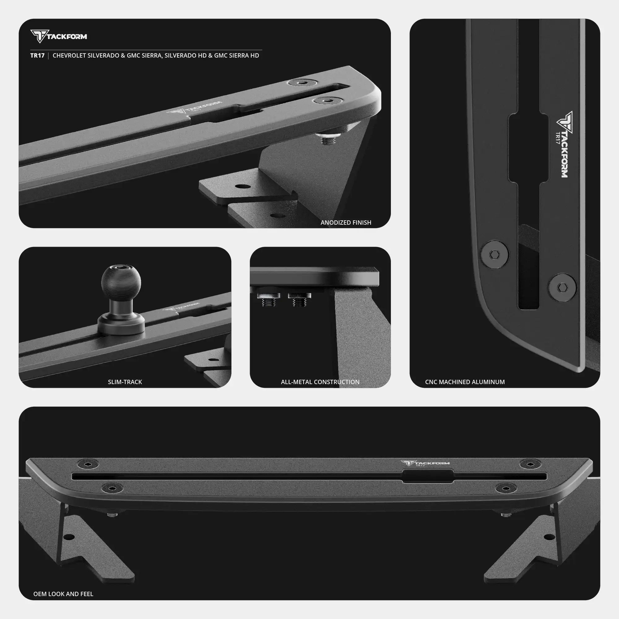Upgrade your 2019-2026 Chevrolet Silverado & GMC Sierra (trim compatibility varies) with the most rugged and dependable dash bracketed tablet mount setup on the market. Engineered to meet the demands of both on-and off-road drivers, each dash bracket is built from high-grade 6061-T6 aluminum and CNC machined for enhanced strength and durability. Using laser scanning technology, our dash brackets are precisely designed to match the complex contours of your dashboard, while the hardcoat anodized finish provides an OEM look and feel, seamlessly blending with your vehicle's interior.