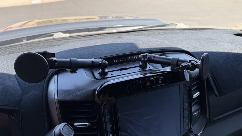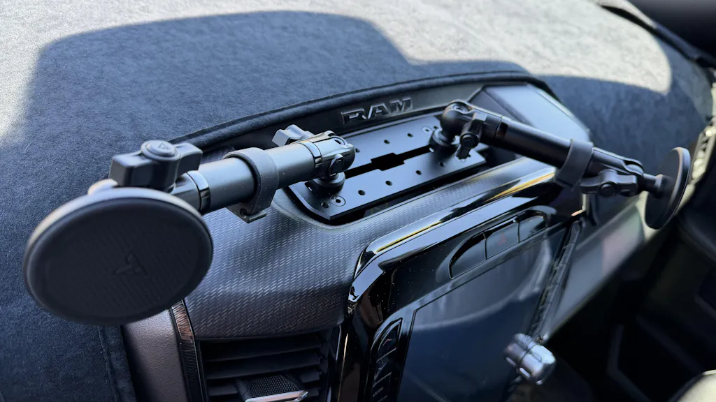 RAM’s unique OEM dash layout calls for a 6" arm on the driver’s side to ensure optimal device placement. When a passenger-side mount is selected, a slightly longer 7" arm is needed to account for the space taken up by the 12V power outlet in the dash tray. This added length allows the arm to mount at the end of the track while still providing ample clearance over the dashboard. All configurations include precision-fit arm rests to ensure rock-solid stability, even in harsh off-road conditions.