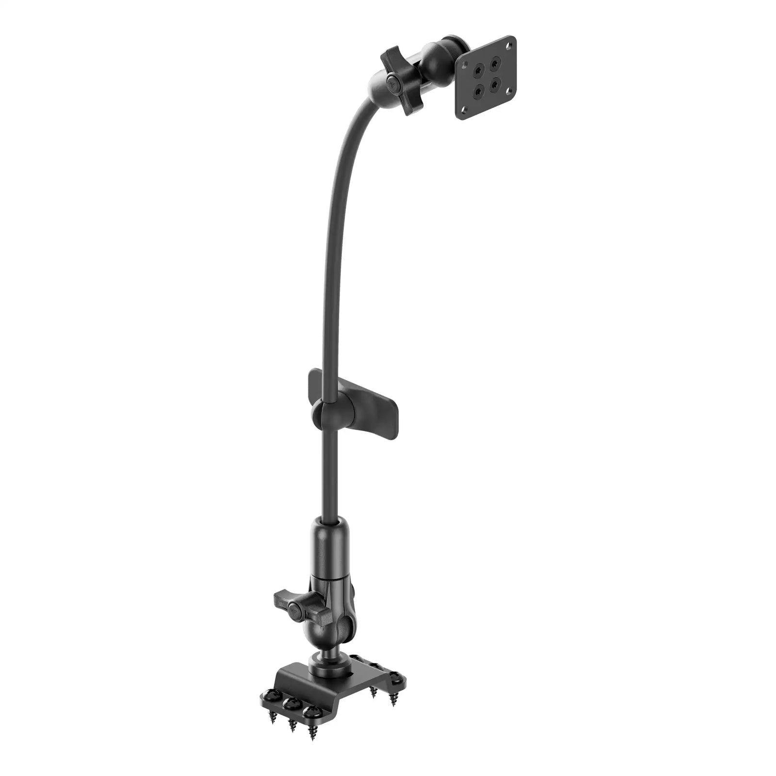 This isn’t your average flex arm. Constructed from industrial grade, heavy duty aluminum, it’s rigid, durable, and holds its position without sagging or drooping. The rigid flex arm allows you to fine tune the ideal position when needed, but it's not intended for frequent repositioning and requires two hands to adjust. Long arms can tend to “sway” in mobile applications, so we’ve included an adhesive backed stabilizer that mounts to your dashboard or center console for added support and rock-solid stability on the road.