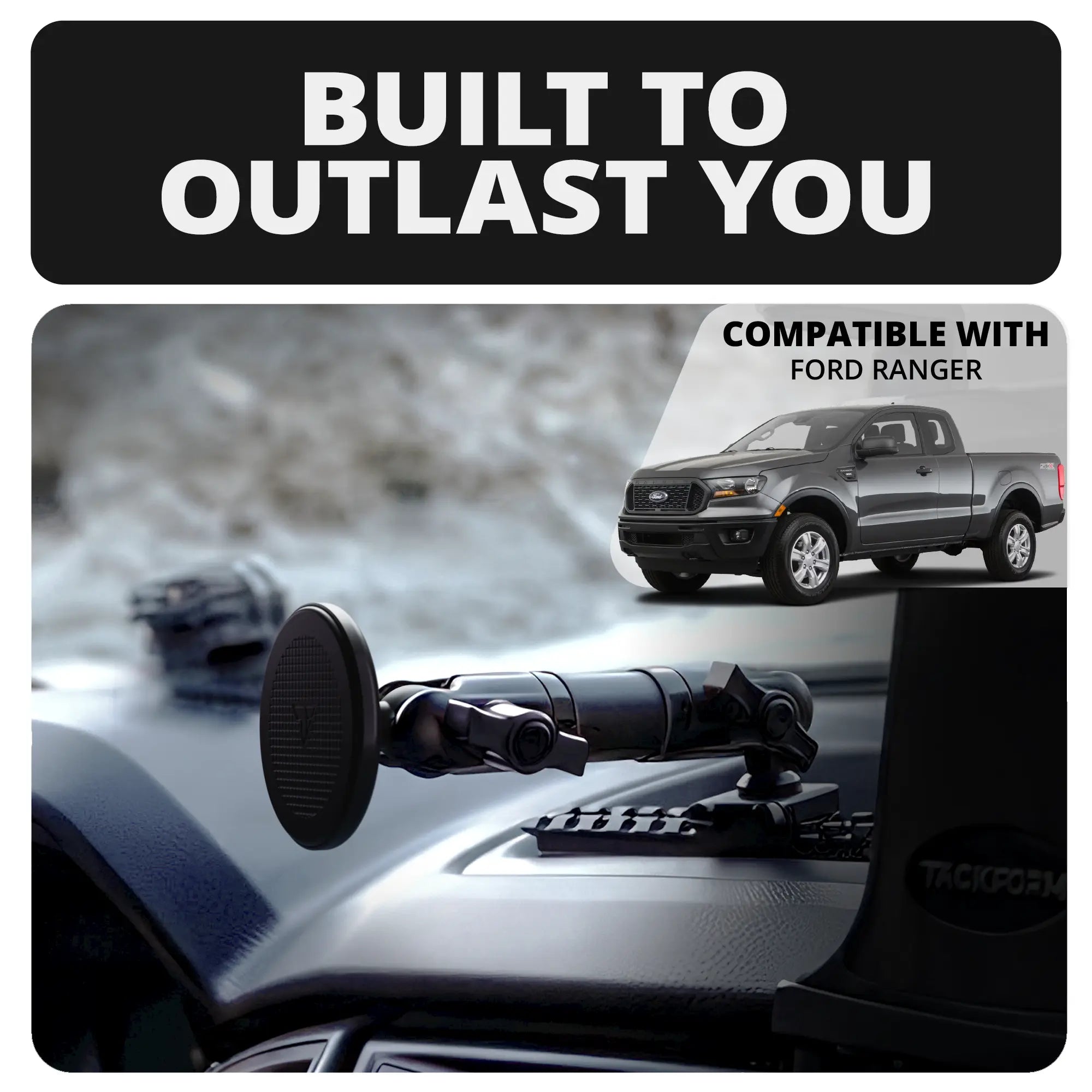 Upgrade your 4th Gen Ford Ranger (2019-2023) with the most rugged and dependable ALL-METAL dash mounted MagSafe phone holder setup on the market. Engineered to meet the demands of both on-and off-road drivers, each Ranger dash kit is built from high-grade 6061-T6 aluminum and CNC machined for enhanced strength and durability. Using laser scanning technology, our dash brackets are precisely designed to match the complex contours of your dashboard, while the hardcoat anodized finish provides an OEM look and feel, seamlessly blending with your vehicle's interior.