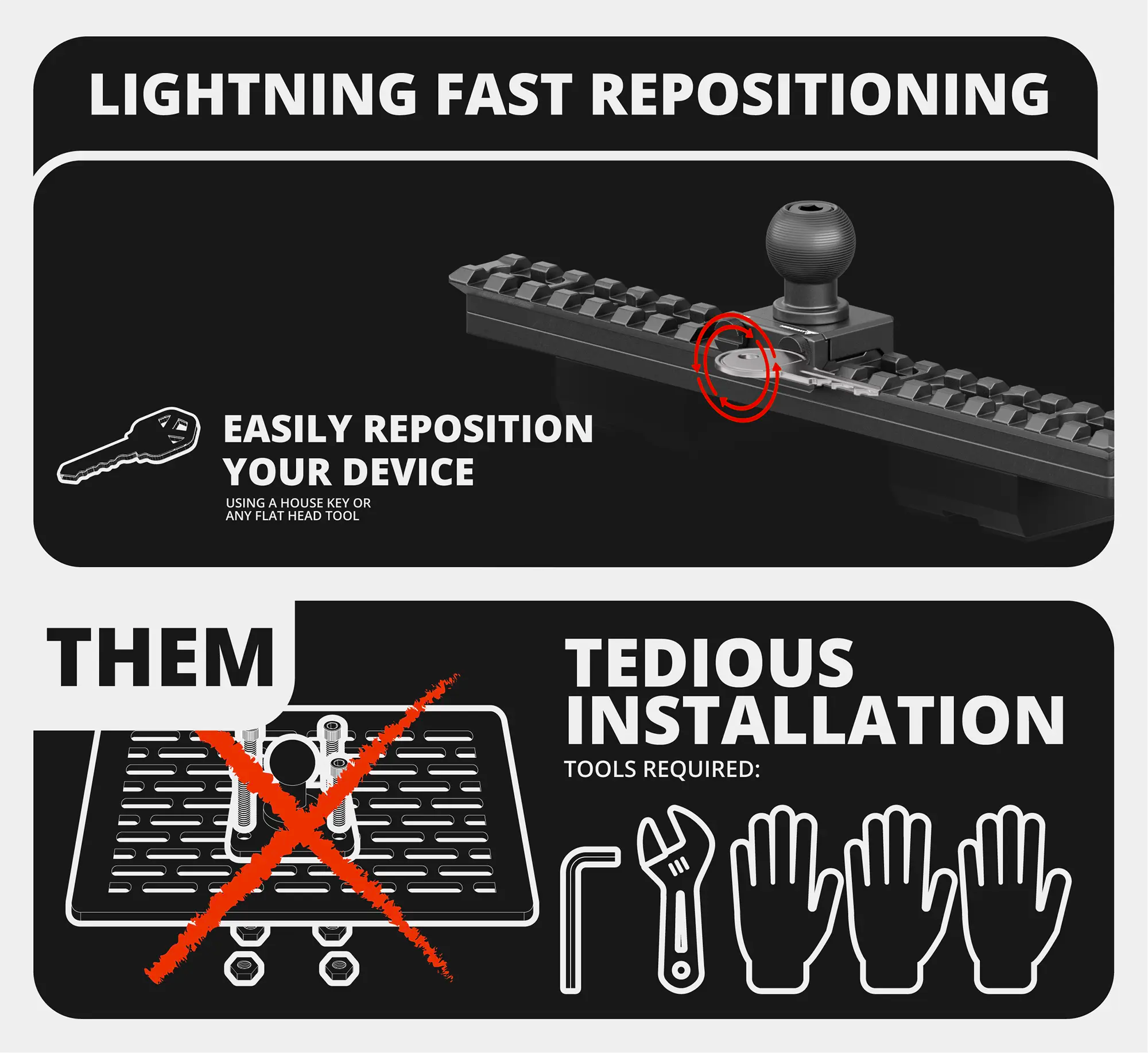 While 'grid-style' dash mounts are trendy, they can be a nightmare when trying to install, move, or reposition your mounting bases. These systems often require partial disassembly of the dash mount to access the nuts beneath the panel. With our intuitive Assault Track system, you’ll never have to fumble with nuts again. Capable of comfortably holding multiple devices, the Assault Track system features a CNC-machined picatinny rail, allowing you to quickly add, remove, or reposition your mounts in seconds.