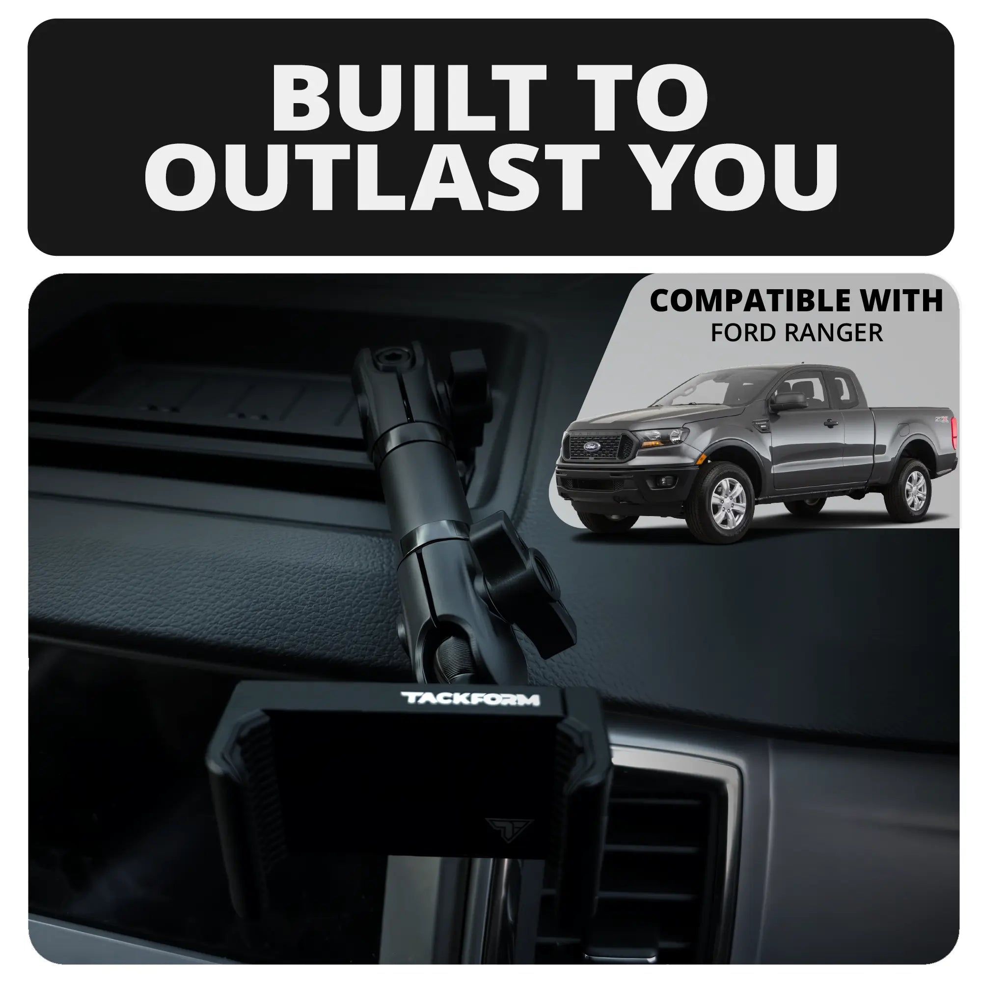 Upgrade your 4th Gen Ford Ranger (2019-2023) with the most rugged and dependable ALL-METAL dash mounted phone holder setup on the market. Engineered to meet the demands of both on-and off-road drivers, each Ranger dash kit is built from high-grade 6061-T6 aluminum and CNC machined for enhanced strength and durability. Using laser scanning technology, our dash brackets are precisely designed to match the complex contours of your dashboard, while the hardcoat anodized finish provides an OEM look and feel, seamlessly blending with your vehicle's interior.