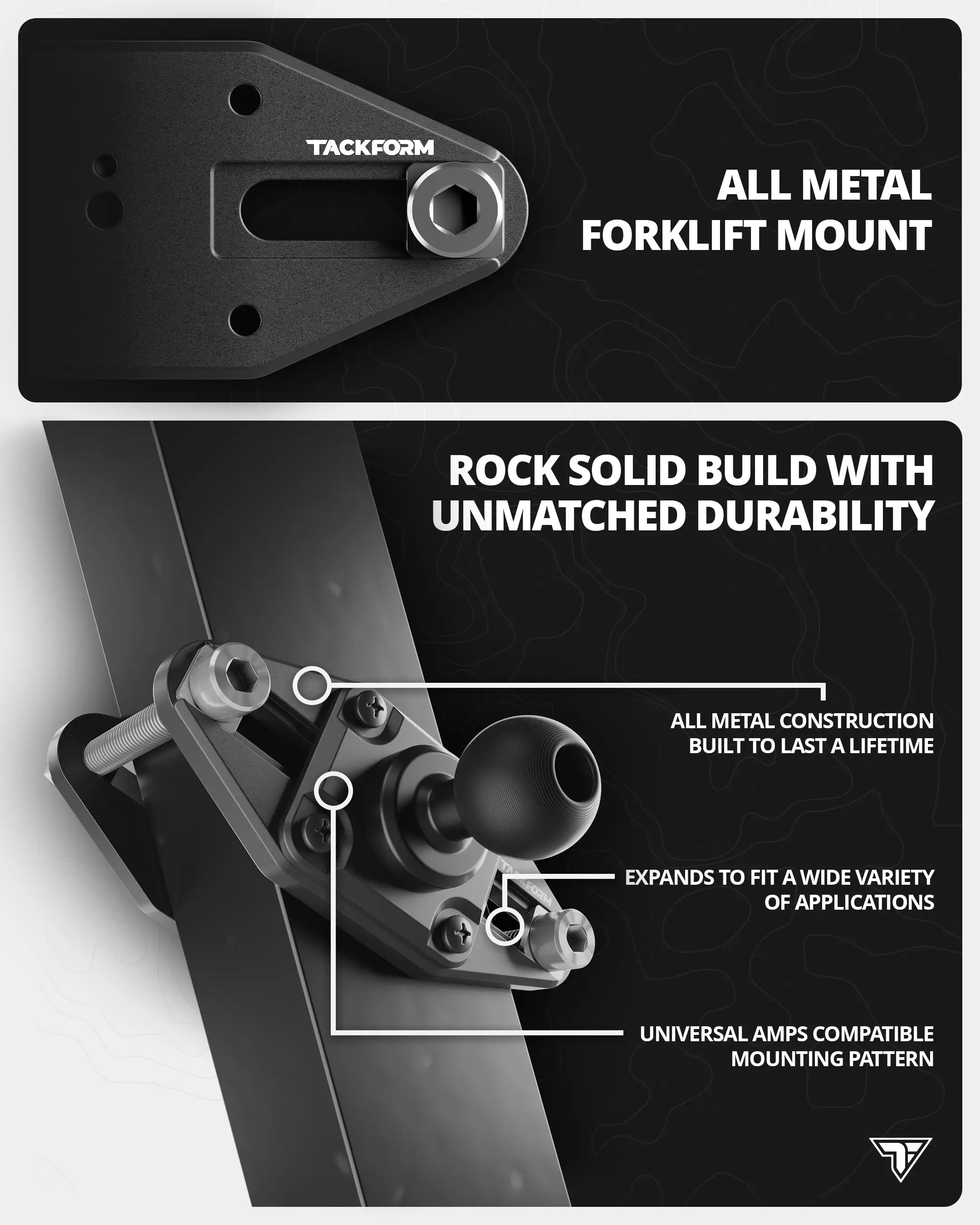 Our Forklift Mounting Kit is designed to fit a wide range of applications and configurations, including forklift pillars/guards with a maximum width of 3.4 inches, and a depth range between 1.6 inches and 4 inches. It supports AMPS connections using the industry-standard hole pattern of 30 millimeters by 38 millimeters (1.181 inches by 1.496 inches). The kit includes our heavy-duty AMPS mount with a 26mm metal ball. Unlike thinner alternatives, our AMPS plate is twice as thick as some competitors’ and reinforced with robust hardware, delivering superior strength and durability under heavy loads.