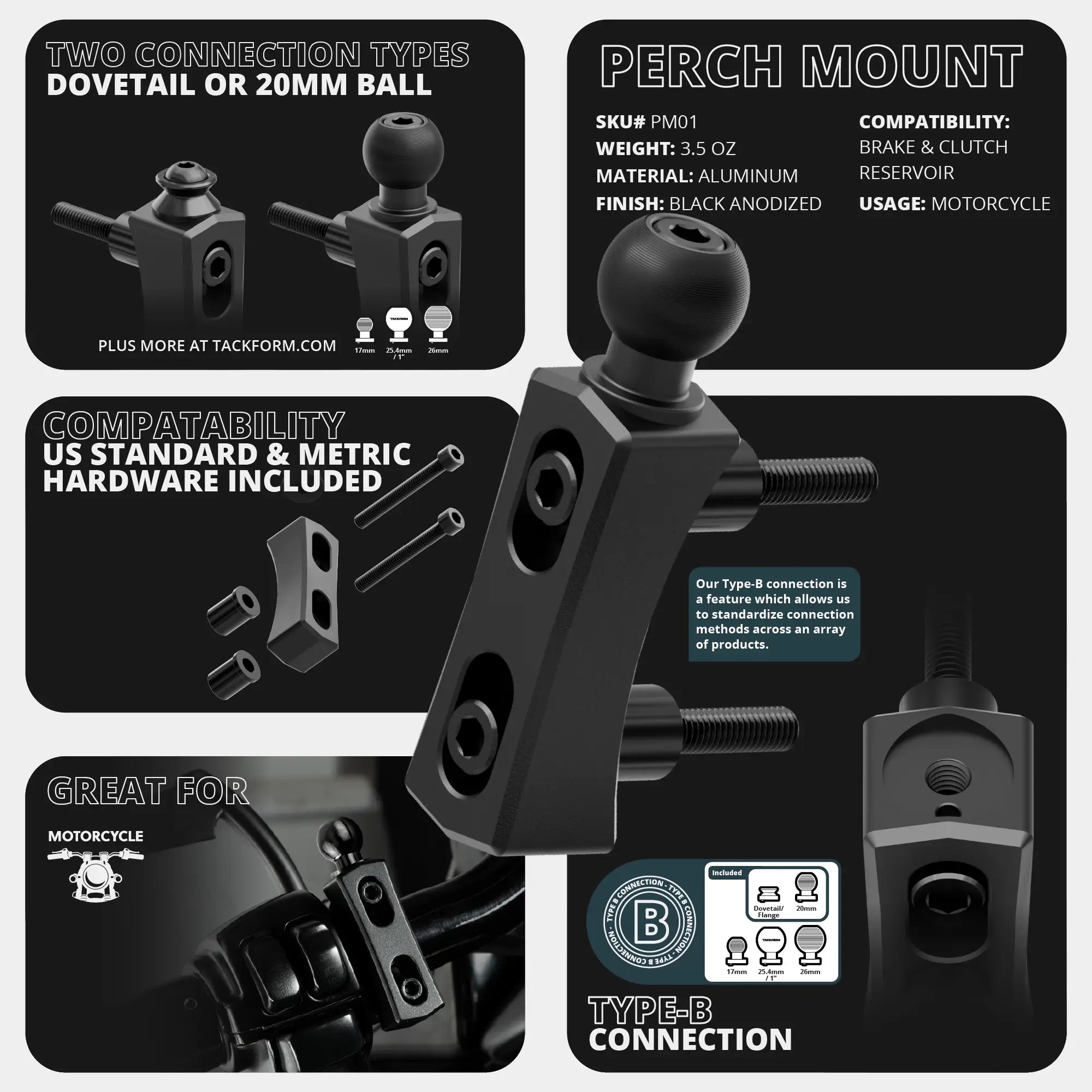 Utilizing the brake/clutch reservoir bolt holes, this mount seamlessly integrates with your Motorcycle's design. Its ball and socket system ensures rock-solid stability for your device, offering convenience and factory-like appearance. Compatible with various models from such brands as Harley-Davidson, Gold Wing, Honda, Kawasaki, Suzuki, Yamaha, and more.