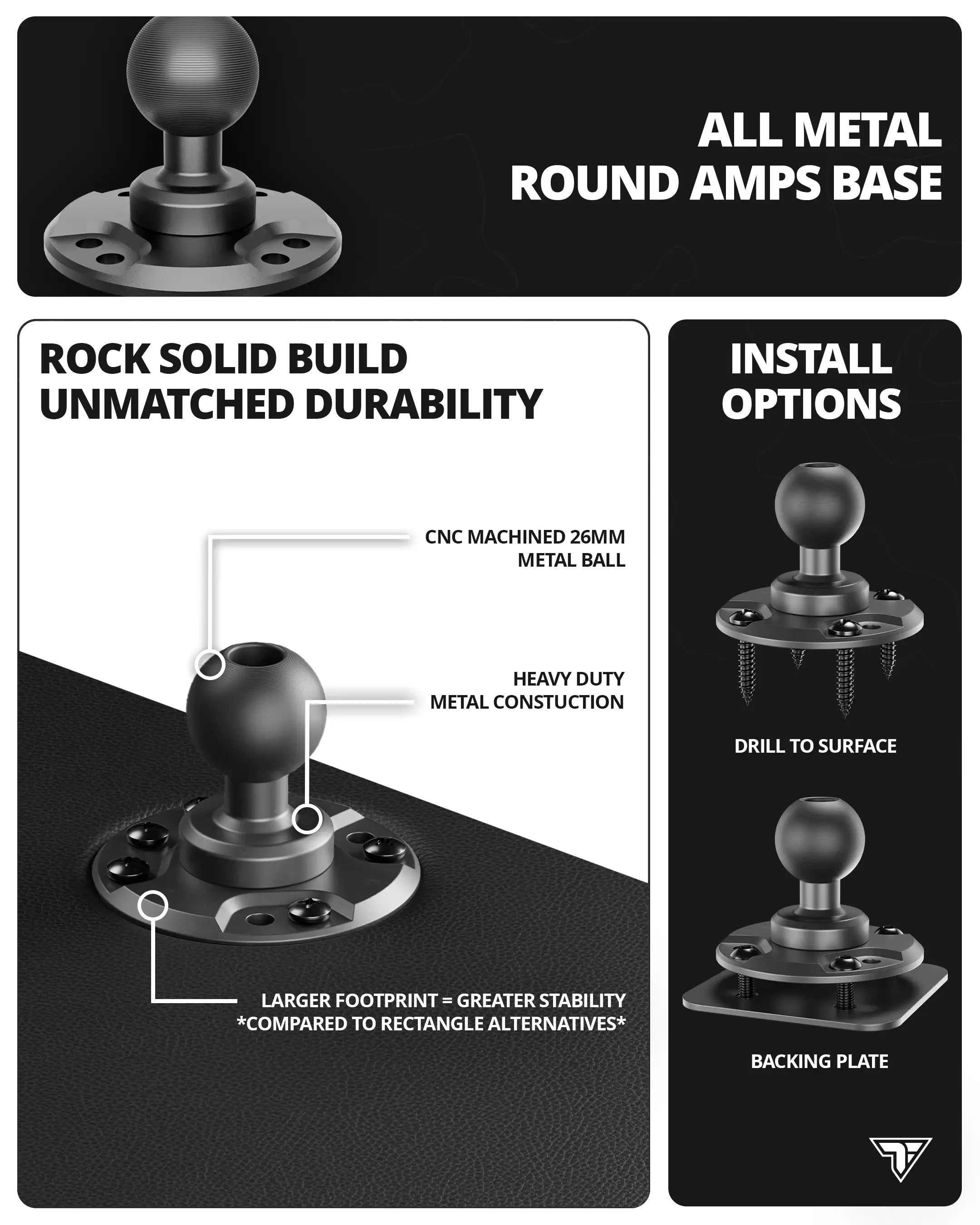 The 6061-T6 aluminum round AMPS base features the industry-standard 30mm x 38mm (1.181" x 1.496") hole pattern and supports both drill and bolt mounting options for flexible installation. Unlike thinner competitor plates, our AMPS mount is built with a plate that is twice as thick and reinforced with heavy duty hardware at the ball connection point, delivering reliable strength under demanding loads. Each kit includes a metal backing plate with integrated nuts, four self-tapping screws, and four machine screws. The backing plate install option is hands down the best choice if you're paying an installer to outfit a fleet. When you factor in installation time, these backing plates are worth their weight in gold.