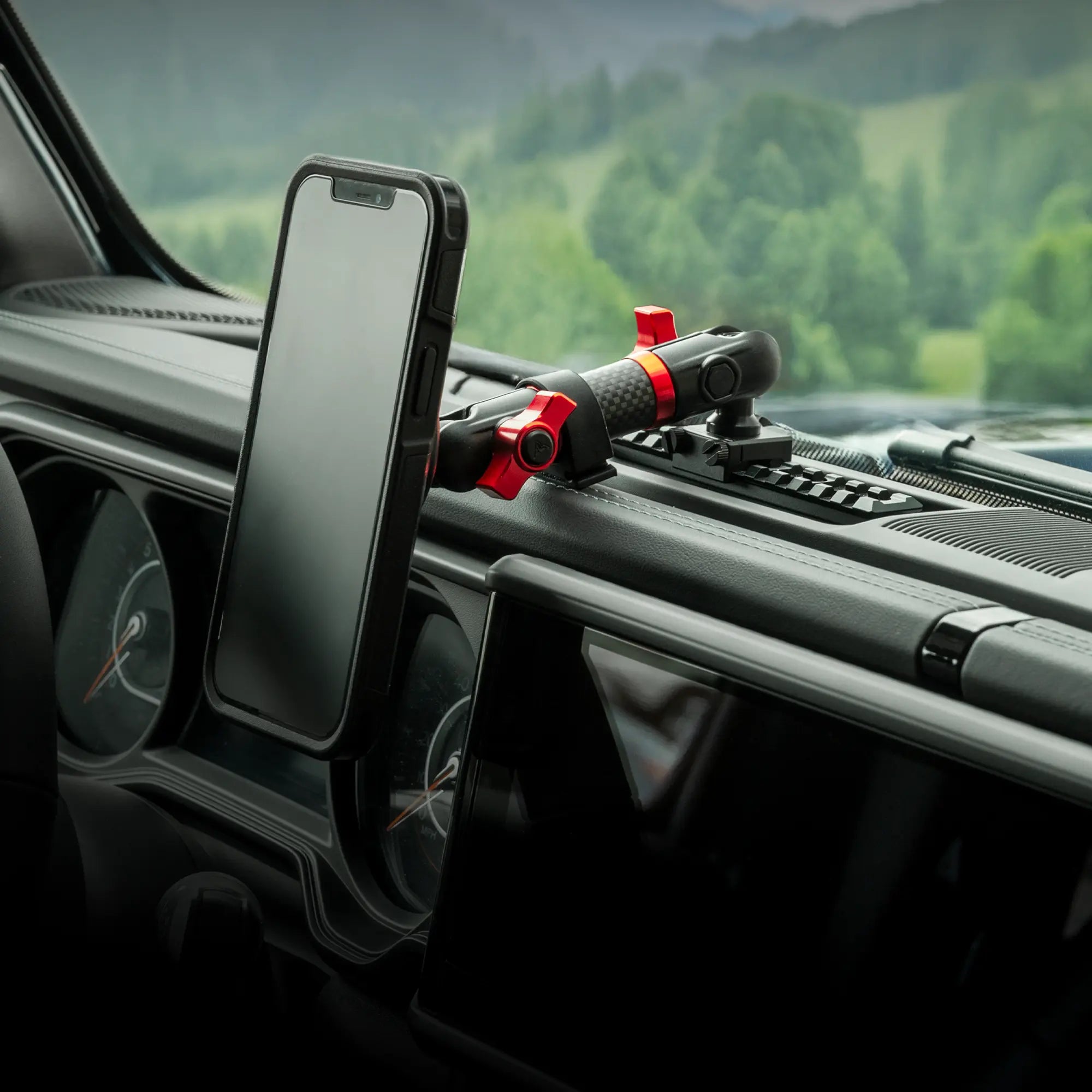 Upgrade your 2024-2025 Jeep Wrangler JL & Gladiator JT with the most rugged and dependable dash bracketed MagSafe wireless charging phone mount setup on the market. Engineered to meet the demands of both on-and off-road drivers, each dash kit is built from high-grade 6061-T6 aluminum and CNC machined for enhanced strength and durability. Using laser scanning technology, our dash brackets are precisely designed to match the complex contours of your dashboard, while the hardcoat anodized finish provides an OEM look and feel, seamlessly blending with your vehicle's interior.