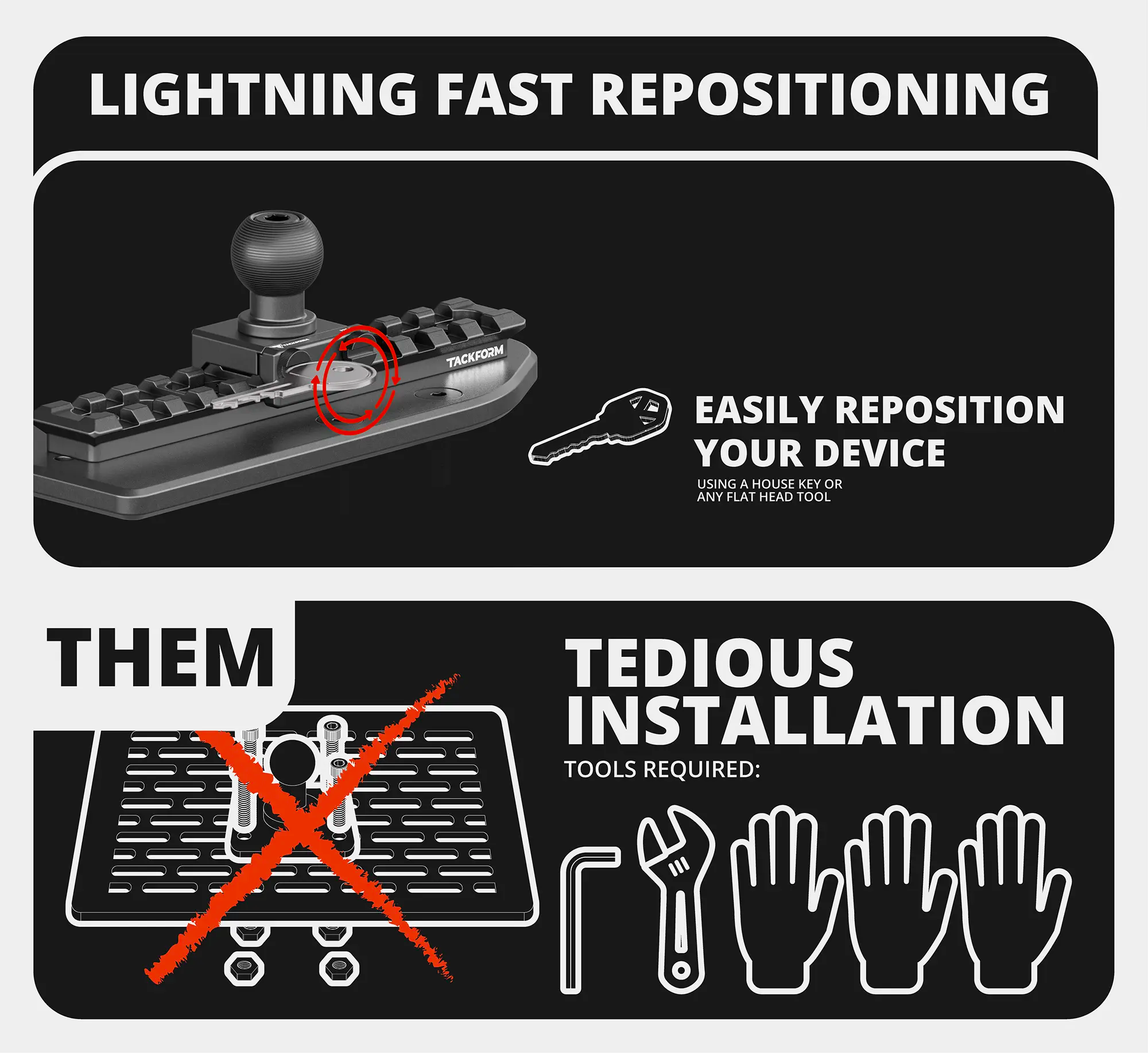 While 'grid-style' dash mounts are trendy, they can be a nightmare when trying to install, move, or reposition your mounting bases. With our intuitive Assault Track system, you’ll never have to fumble with nuts again. Capable of comfortably holding a variety of devices, the Assault Track system features a CNC-machined billet aluminum picatinny rail, allowing you to quickly add, remove, or reposition your mounts in seconds with nothing more than a house key.