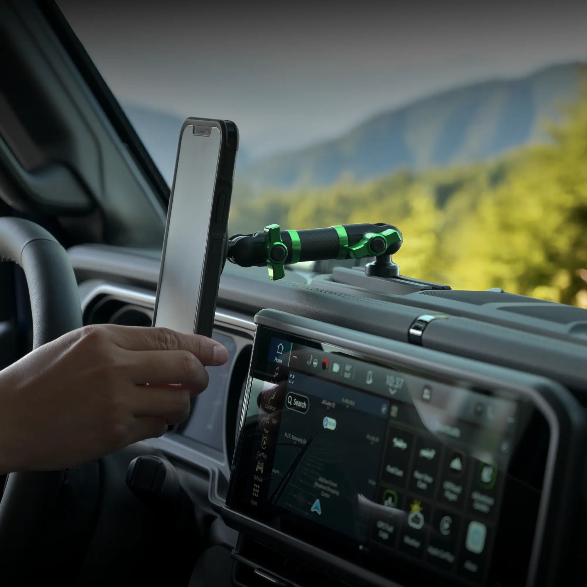 Upgrade your 2024-2025 Jeep Wrangler JL & Gladiator JT with the most rugged and dependable dash bracketed MagSafe wireless charging phone mount setup on the market. Engineered to meet the demands of both on-and off-road drivers, each dash kit is built from high-grade 6061-T6 aluminum and CNC machined for enhanced strength and durability. Using laser scanning technology, our dash brackets are precisely designed to match the complex contours of your dashboard, while the hardcoat anodized finish provides an OEM look and feel, seamlessly blending with your vehicle's interior.