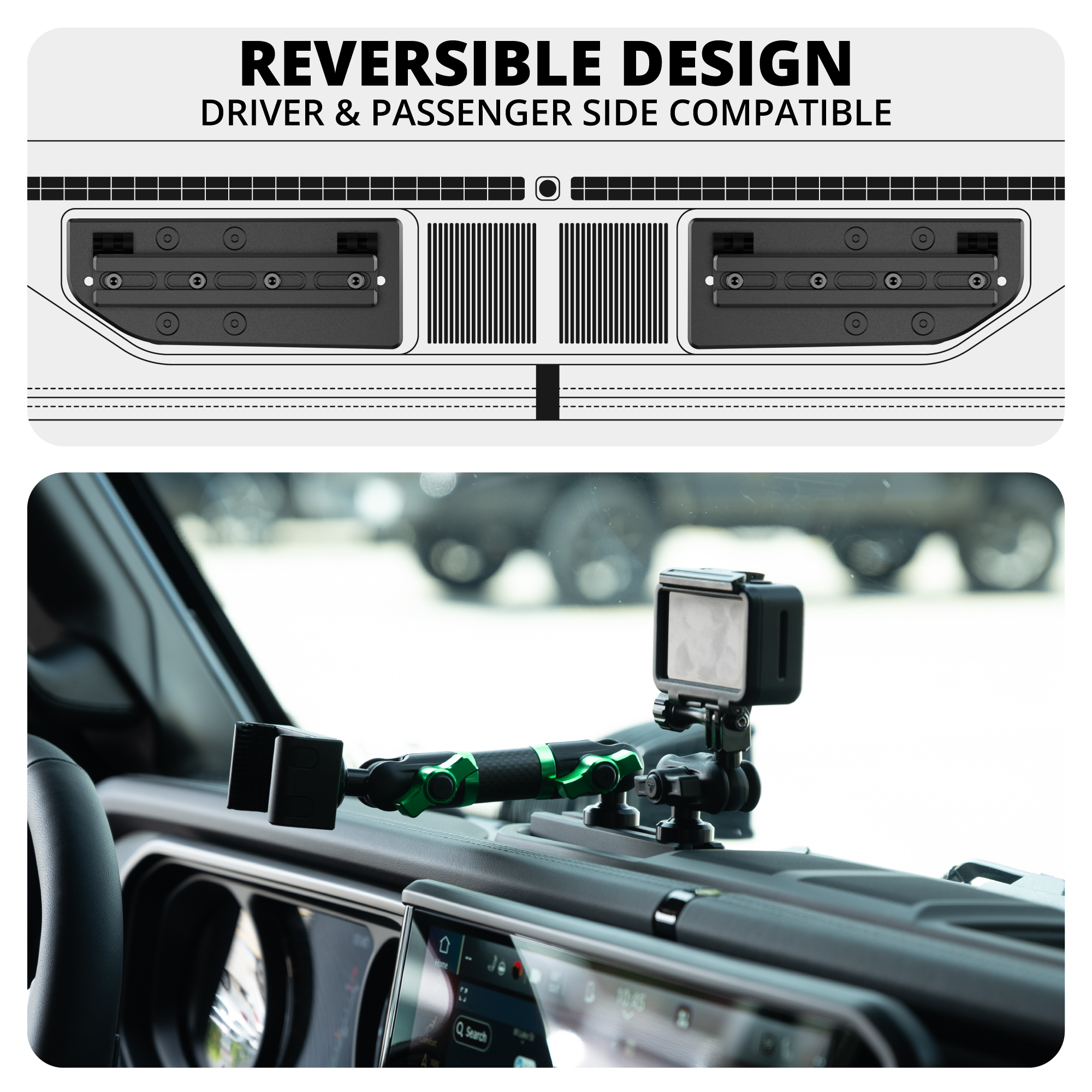 The reversible design allows for installation in either the driver or passenger side dash tray slot, giving you the freedom to configure your setup exactly how you want it. Whether you're daily driving, heading out on a weekend adventure, or building a fully outfitted rig, this flexibility ensures your phone, GPS, or comms gear is always within easy reach.