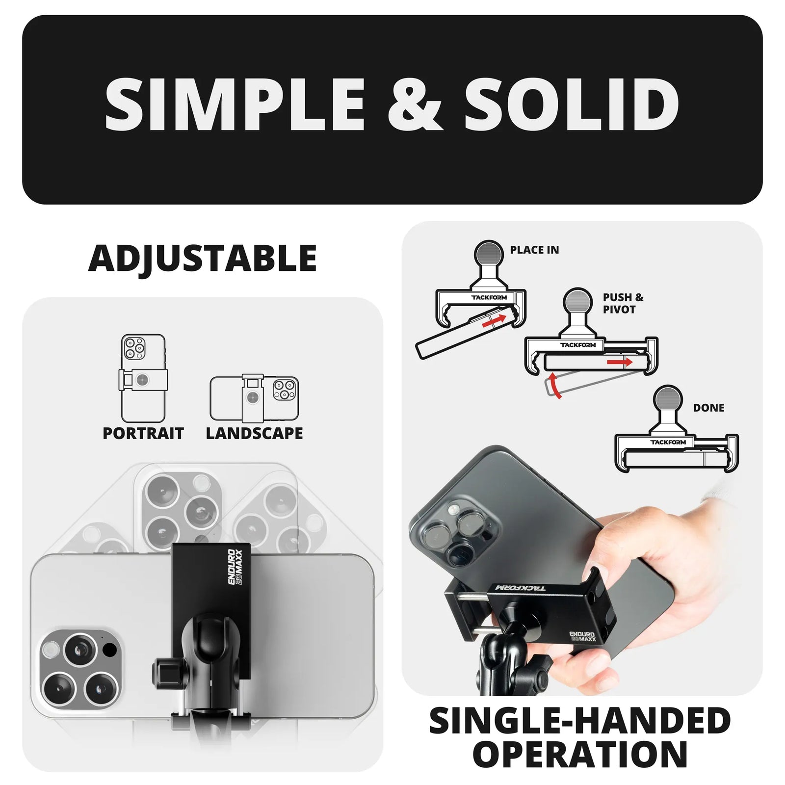 Our phone holder is designed to seamlessly work with nearly all smartphone models, cases, and sizes. While you're on the go, it ensures a secure fit for any device, whether or not it's in a case. Capable of securely holding devices up to 3.7" wide and 0.6" thick. The Tackform CNC billet aluminum phone holder utilizes a 20mm ball connection and is specifically designed for compatibility with our 20 Series Platform, revolving around the 20mm ball and socket system.