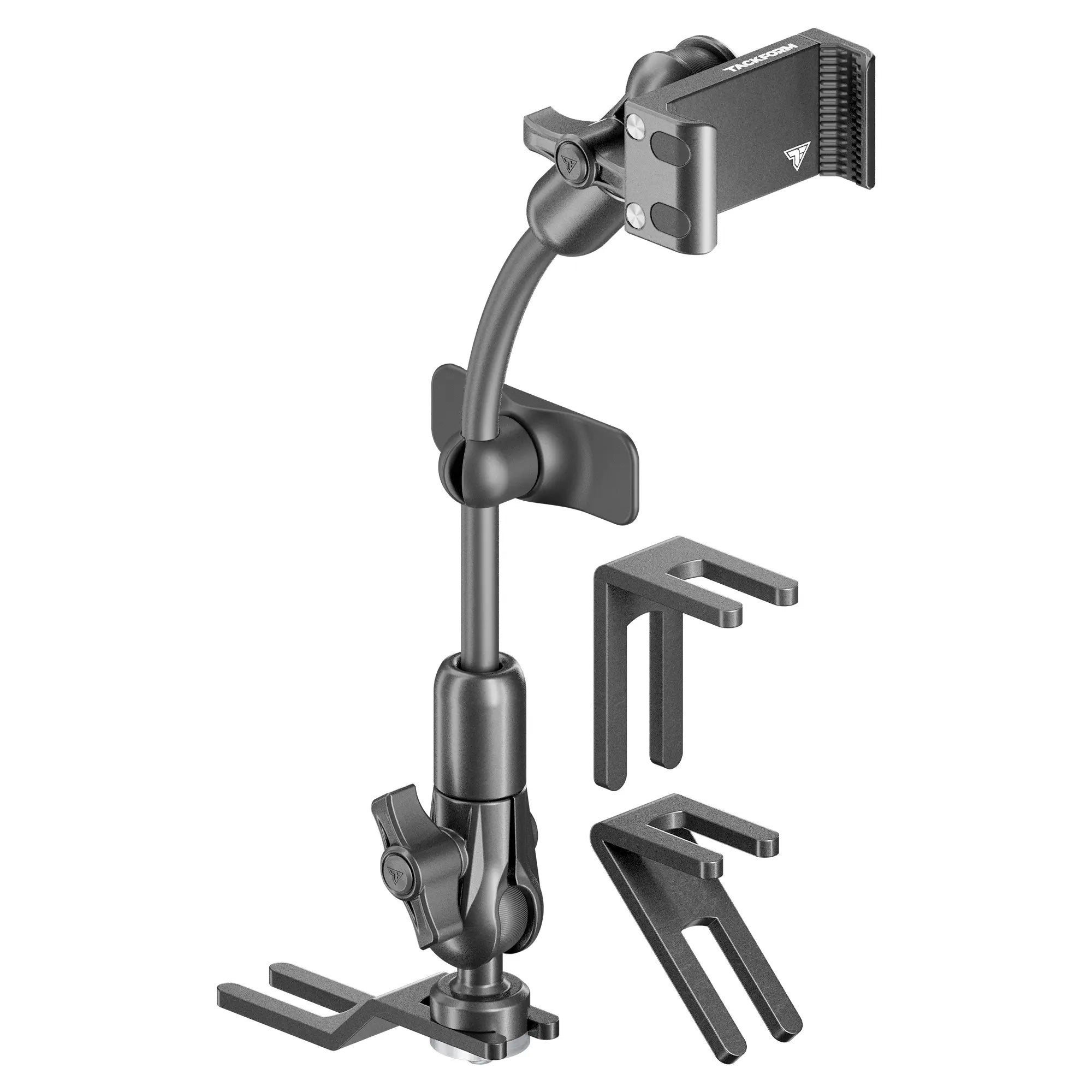 This isn’t your average flex arm. Constructed from industrial grade, heavy duty aluminum, it’s rigid, durable, and holds its position without sagging or drooping. The rigid flex arm allows you to fine tune the ideal position when needed, but it's not intended for frequent repositioning and requires two hands to adjust. Long arms can tend to “sway” in mobile applications, so we’ve included an adhesive backed stabilizer that mounts to your dashboard or center console for added support and rock-solid stability on the road.