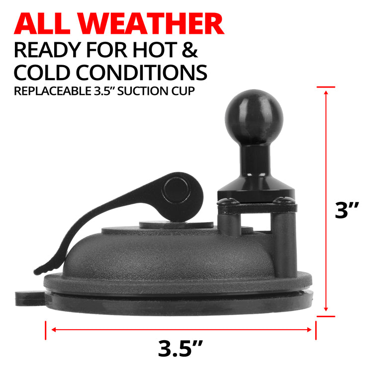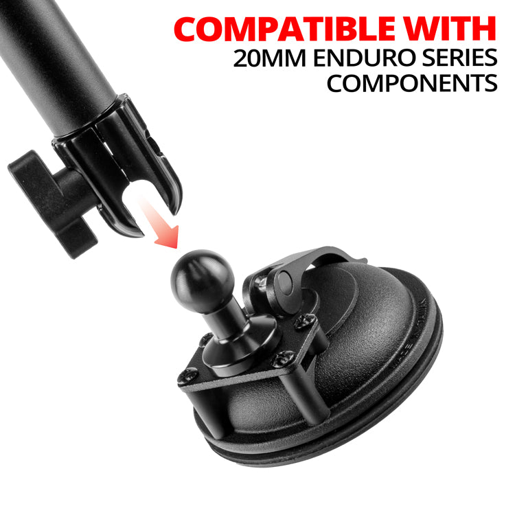 This 3.5 inch diameter suction cup mount with a 20mm ball is one of several components recently purchased. The perfect way to set up both a reversing camera monitor and a Garmin GPS in my 2009 Land Rover Defender without unnecessary drill holes in the dashboard. The standard plastic Garmin suction mount tends to drop off the windscreen regularly.