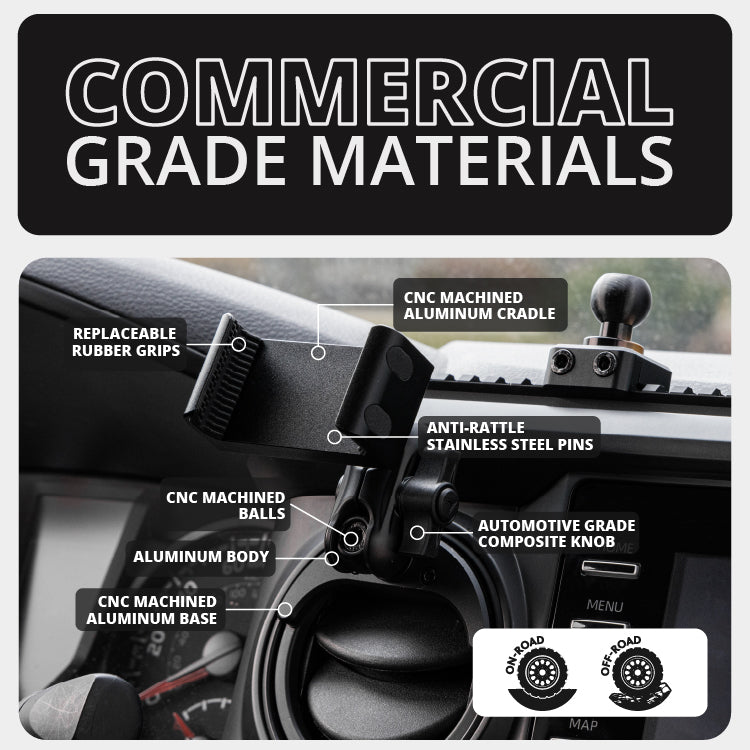 Upgrade your 2016-2023 Toyota Tacoma and 2014-2021 Toyota Tundra with the most dependable ALL-METAL vent mounted phone holder on the market. Engineered to meet the demands of both on-and off-road drivers, each vent mount kit is built from high-grade 6061-T6 aluminum and CNC machined for enhanced strength and durability. Using laser scanning technology, our vent brackets are precisely designed to match the complex contours of your vent bezel, while the hardcoat anodized finish provides an OEM look and feel, seamlessly blending with your vehicle's interior.