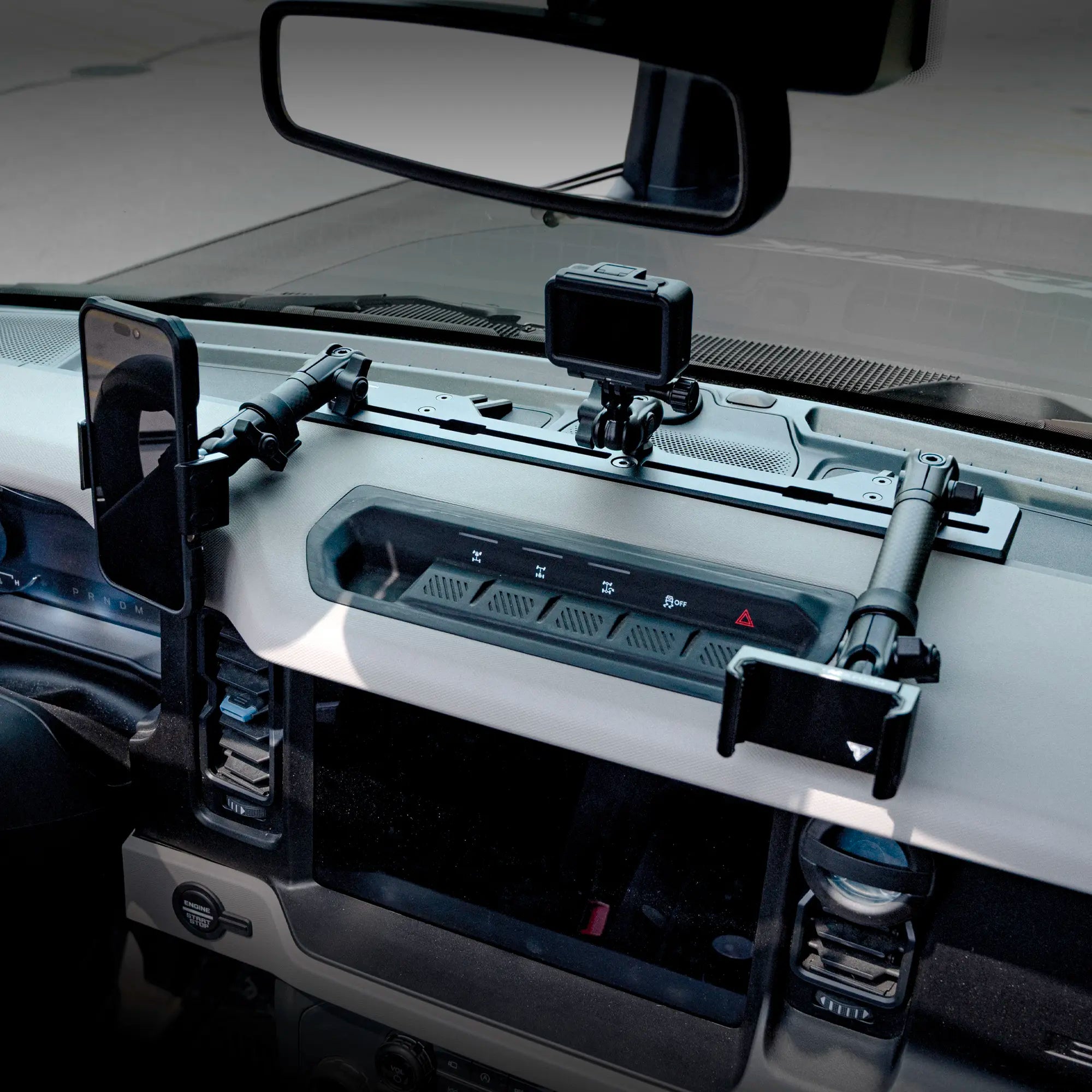Transform your dashboard from a passive space into an active control hub with a Tackform mount stack. Our multi-mount dash bracket provides the necessary structure and expansive mounting capability to fully utilize your Bronco's dash for navigation, communication, or content creation like never before.