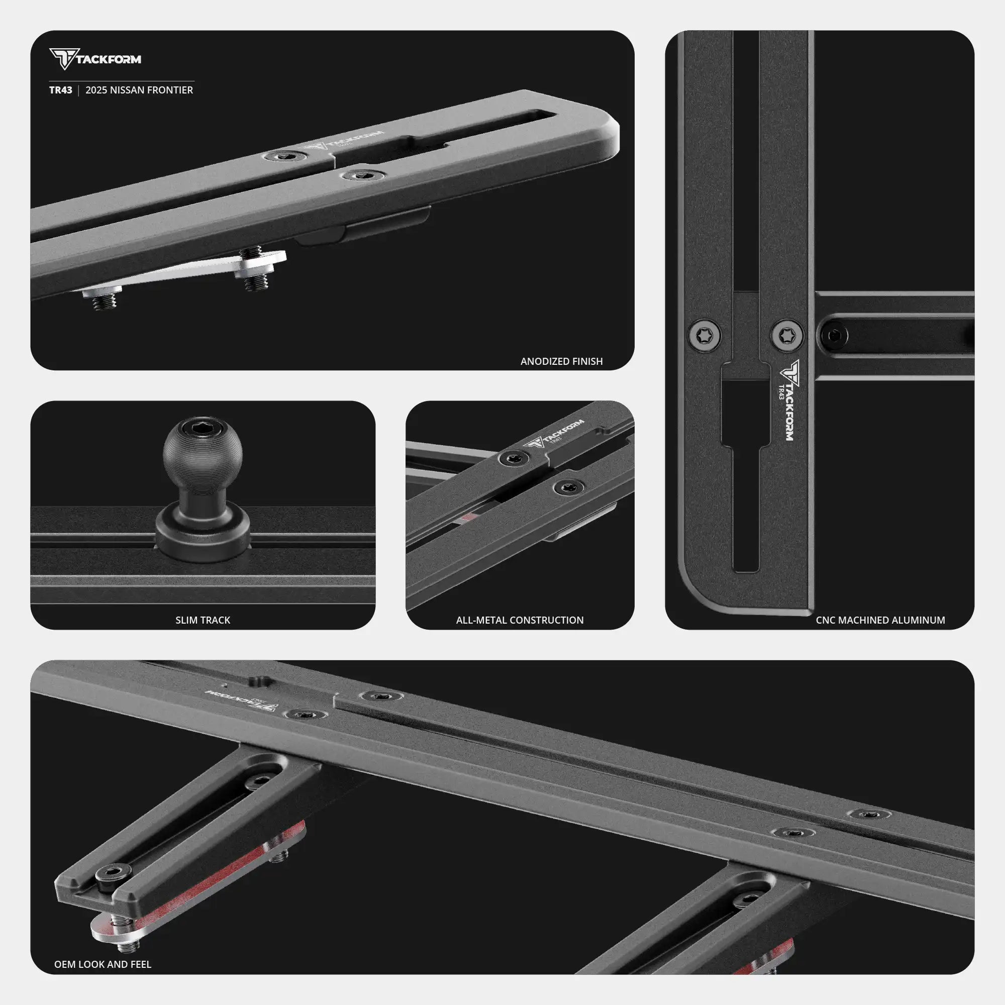 Upgrade your 2025 Nissan Frontier with the most rugged and dependable ALL-METAL dash mount bracket on the market. Engineered to meet the demands of both on-and off-road drivers, each dash bracket is built from high-grade 6061-T6 aluminum and CNC machined for enhanced strength and durability. Using laser scanning technology, our dash brackets are precisely designed to match the complex contours of your dashboard, while the hardcoat anodized finish provides an OEM look and feel, seamlessly blending with your vehicle's interior.